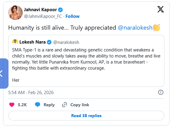 జాన్వీ కపూర్ చేసిన ఈ కామెంట్ ఇప్పుడు నెట్టింట తెగ వైరల్ అవుతోంది. ఒక చిన్నారి ప్రాణం కోసం పార్టీలకు అతీతంగా అందరూ కలిసి రావడం, ముఖ్యంగా ఒక బాధ్యతాయుతమైన పదవిలో ఉండి లోకేశ్ తీసుకున్న చొరవపై నెటిజన్లు సైతం "రియల్ హీరో" అంటూ కామెంట్లతో ముంచెత్తుతున్నారు.